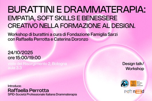 Venerdì 24 ottobre, dalle 15:00 alle 19:00 in aula 3.3, è previsto un workshop di costruzione di burattini a cura della Fondazione Famiglia Sarzi di Reggio Emilia, rivolto a studentesse e studenti del Corso di laurea in Design del Prodotto Industriale. L’iniziativa rientra tra le attività del progetto POT NEED.