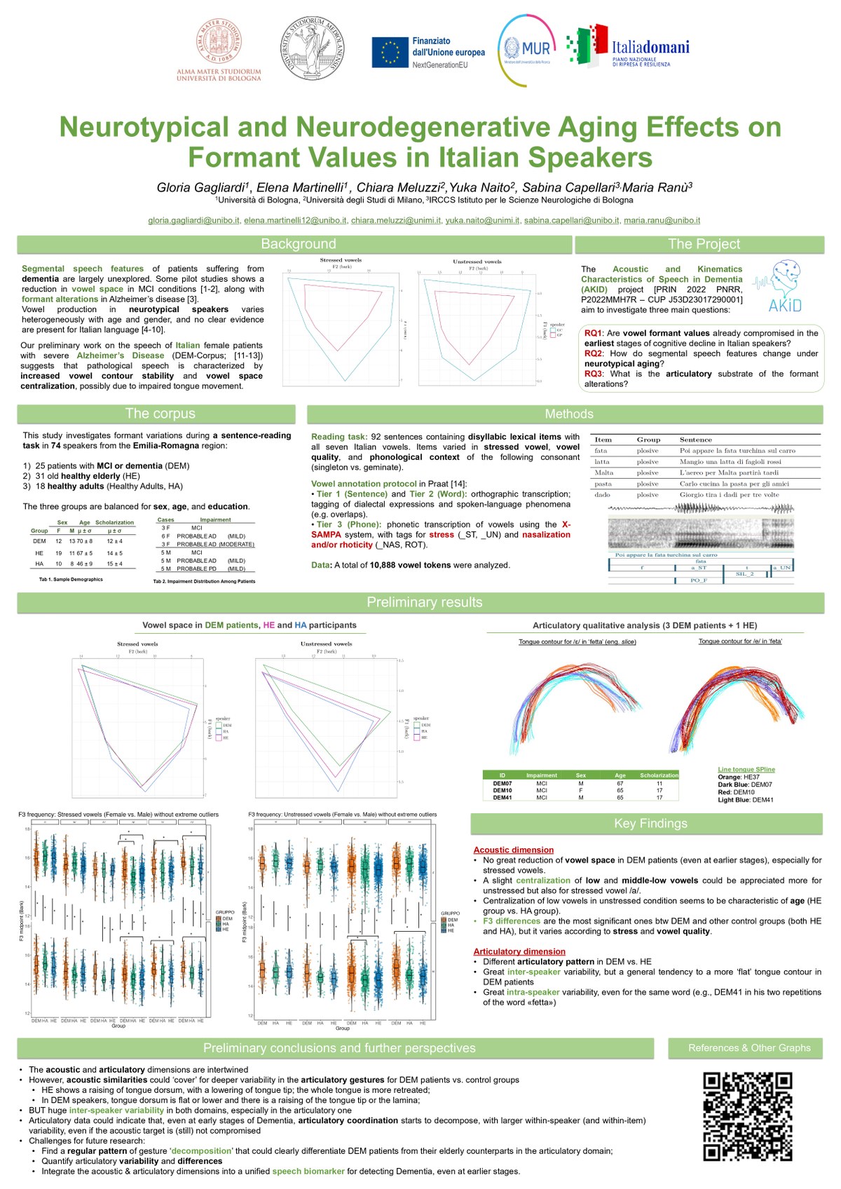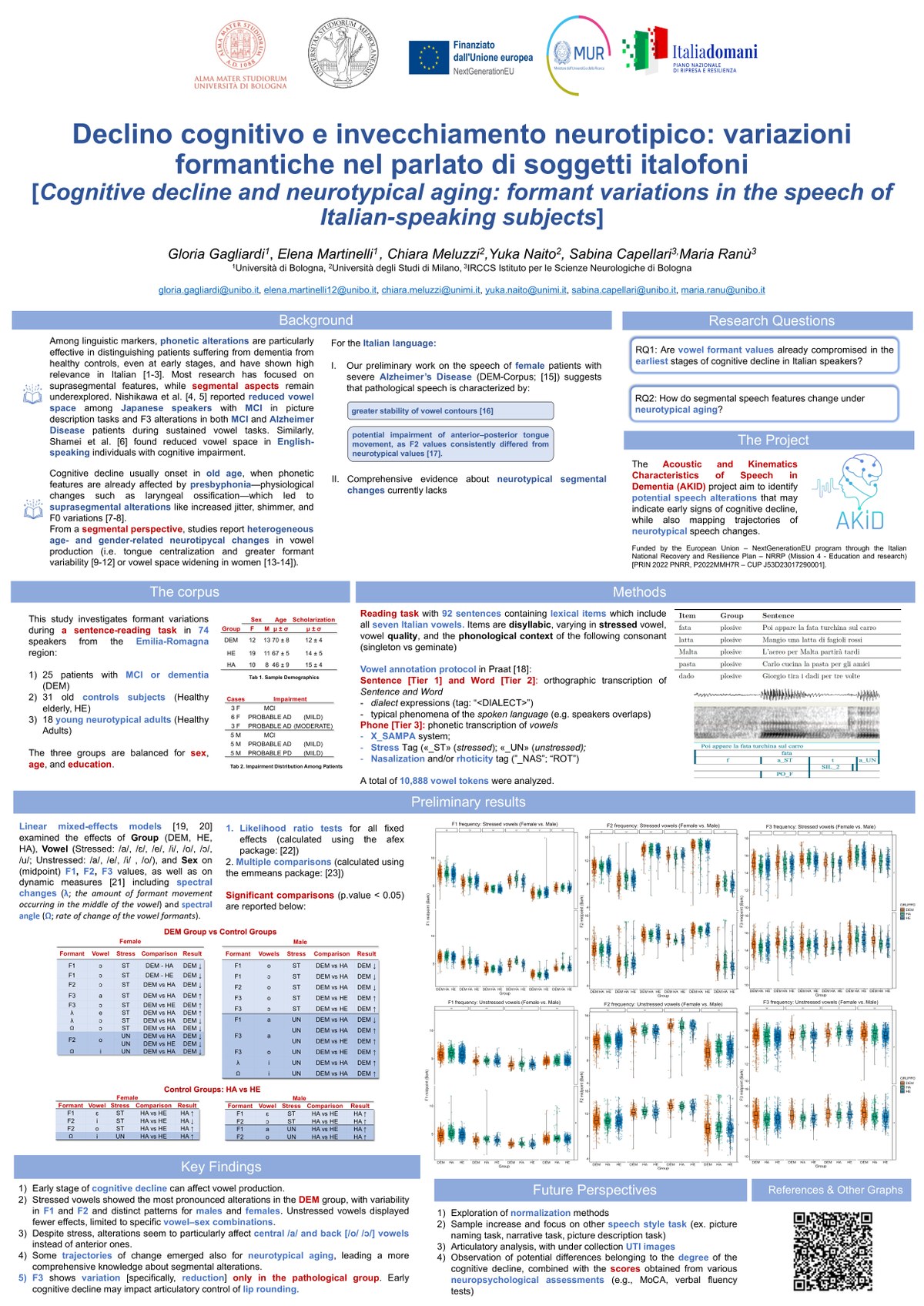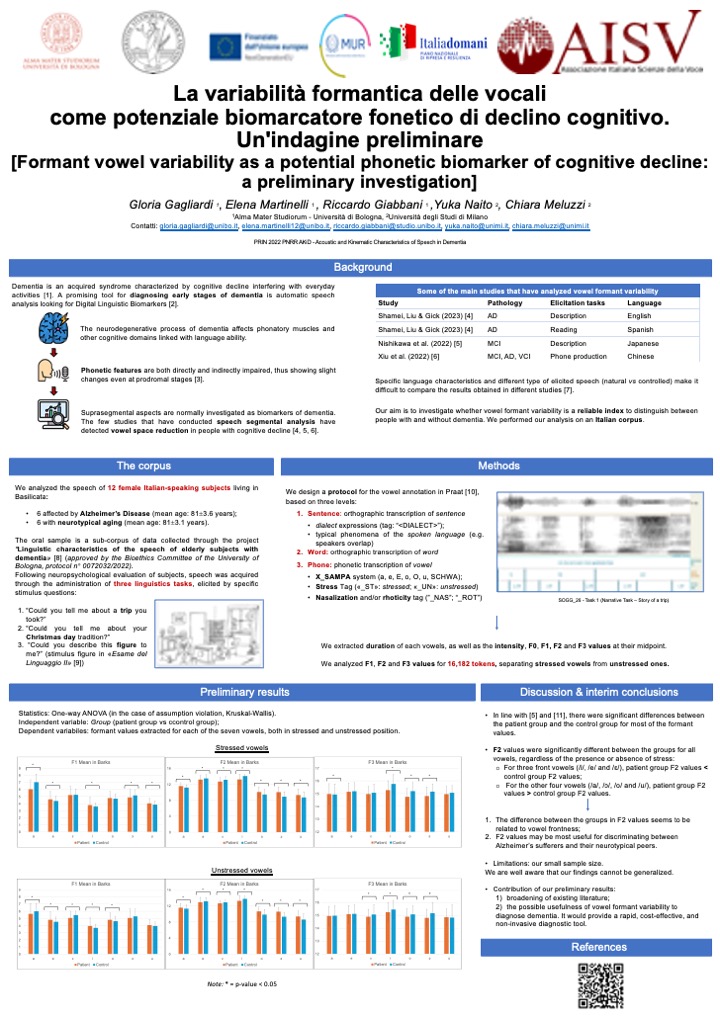 Gagliardi G., Martinelli E., Giabbani R., Naito Y. & Meluzzi C., La variabilità formantica delle vocali come potenziale biomarcatore fonetico di declino cognitivo. Un'indagine preliminare. XXI AISV Annual Conference “The sound of grammar. New perspectives on the interplay of phonetics with morphology, syntax and the lexicon”, February 6-8, 2025, Urbino, University of Urbino Carlo Bo.