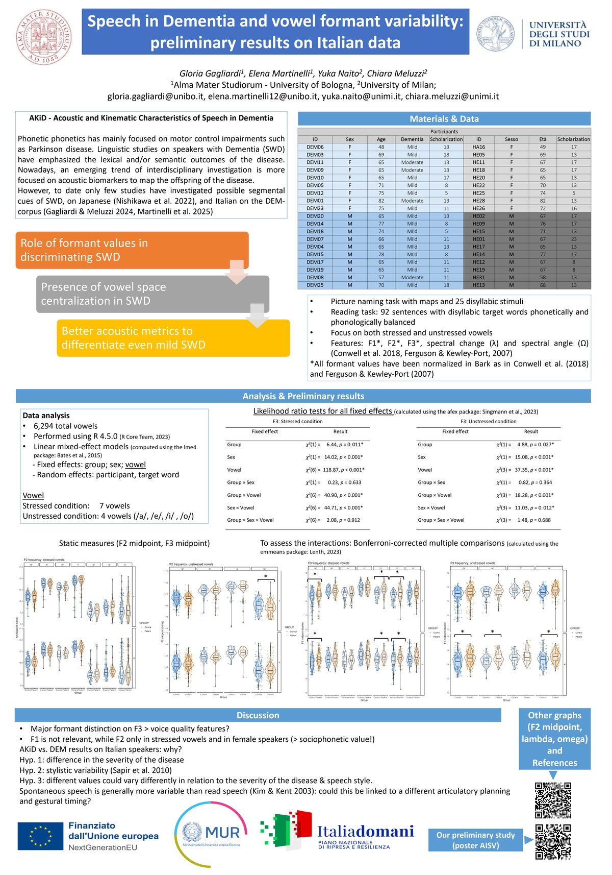Gagliardi, G., Martinelli, E., Naito, Y. & Meluzzi, C. “Speech in Dementia and vowel formant variability: preliminary results on Italian data. Congresso internazionale del Gruppo di Studio sulla Comunicazione Parlata “La Comunicazione Parlata / Spoken Communication”, 19–21 Giugno 2025, Università di Foggia, Foggia.