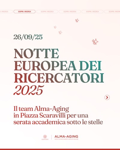 La nostra presenza alla Notte dei Ricercatori si inserisce nel percorso che Alma-Aging porta avanti durante tutto l’anno, con momenti di confronto scientifico, incontri di divulgazione e iniziative pubbliche. Si tratta del tassello di una timeline più ampia, che vede il nostro team impegnato a costruire un dialogo costante tra ricerca e comunità.