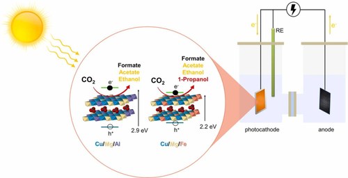 Using CuMg-based Layered Double Hydroxides (LDHs) as multifunctional materials, we developed active photocathodes that provide both visible-light absorption and catalytic sites. These electrodes enable the conversion of CO₂ into valuable C₂ and C₃ products—such as acetic acid, ethanol, and 1-propanol—under low applied voltage and solar light irradiation. This research highlights the potential of LDHs as versatile, tunable materials for solar fuel production and carbon utilization, marking a step forward in sustainable catalysis and solar-driven carbon recycling.