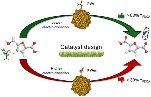 In this work, we explored how polymeric stabilizers can tune the electronic properties of gold nanoparticle catalysts, ultimately shaping the reaction mechanism and product distribution in the oxidation of HMF to FDCA — a key step toward more sustainable plastic production. The work provides new mechanistic insights into how stabilizer design can be leveraged to tailor catalytic performance in mild, aqueous conditions.
