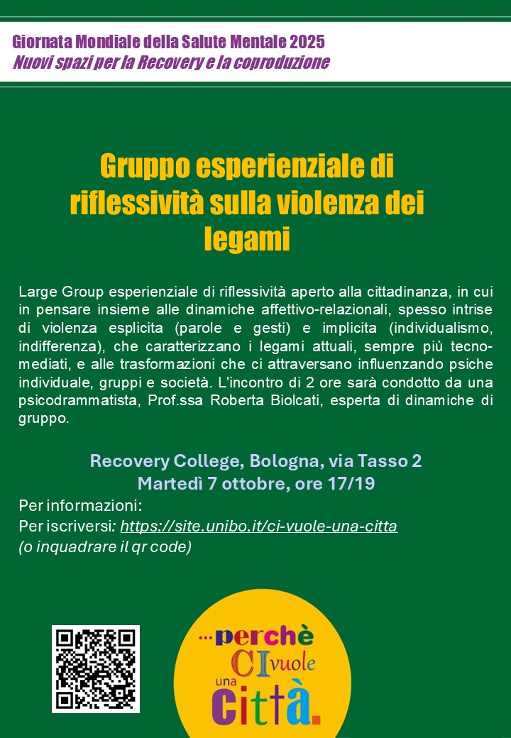 Large Group esperienziale di riflessività aperto alla cittadinanza, in cui pensare insieme alle dinamiche affettivo-relazionali, spesso intrise di violenza esplicita (parole e gesti) e implicita (individualismo, indifferenza), che caratterizzano i legami attuali, sempre più tecno-mediati, e alle trasformazioni che ci attraversano influenzando psiche individuale, gruppi e società. L'incontro di 2 ore sarà condotto da una psicodrammatista esperta di dinamiche di gruppo. E' importante disporre di sedie movibili da disporre circolarmente.