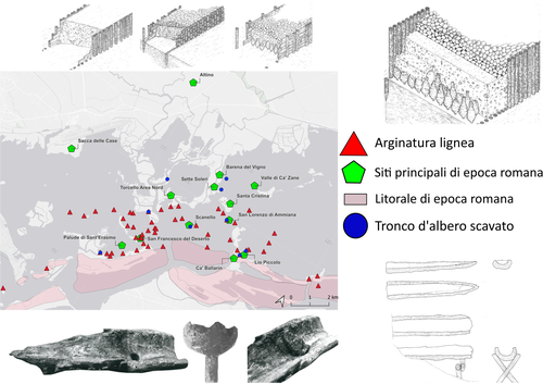 According to a compelling hypothesis, the embankment structures made of wooden cages filled with amphorae—whose function was to separate “water from other water”—may be linked to the presence of ancient saltworks and/or fishponds. Widespread in the areas closest to the ancient shorelines of the northern Venetian lagoon, these structures are sometimes associated with particular artefacts made from tree trunks hollowed out internally (monoxyls). One such example, still preserved and visible at the agriturismo Le Saline in Lio Piccolo, can be interpreted as a hydraulic element used in antiquity for water management.