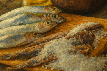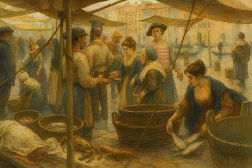 In September 1533, the Provveditori alla Sanità decreed that fish intended for salting had to be “salted at the pole,” meaning brought to the Palo of Rialto and San Marco, the central point for wholesale collection and sale. Here, the compravendipesce (fish brokers) selected it according to quality and directed it toward salting and retail distribution. Cookbooks of the period list numerous varieties of fish preserved in this way: eels, mullets, gilthead bream, sardines, and anchovies. Salting was not merely a technique but an integral part of the lagoon’s food culture.