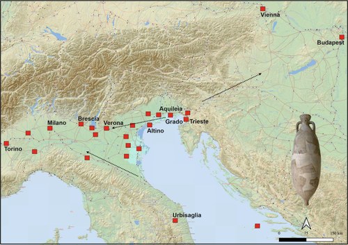 Along the northern Adriatic, archaeologists have not found structures of this type, but coastal communities certainly consumed preserved fish products, as evidenced by the numerous amphorae recovered. Some came from distant provinces of the Empire, such as Baetica in southern Spain, while others point to significant Adriatic production, traded both in reused wine and oil amphorae and in specific containers such as the “Adriatic fish amphoriskoi” and the “Grado I” type. The exact production sites of these latter forms are still uncertain, though the area of Aquileia is a possibility. They were widely consumed throughout northern Italy and distributed as far as the northeastern provinces up to the Danube limes.