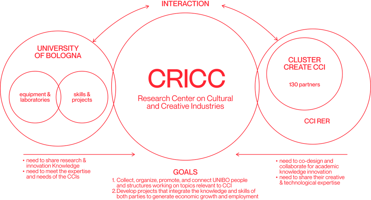 The University of Bologna's Research Center on Cultural and Creative Industries aims to strengthen the regional production system and economic development of the ICC sector by integrating research, digital and enabling technologies, creativity, and culture.