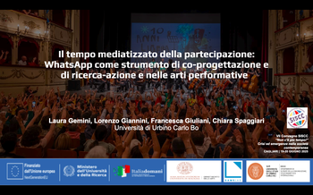 Il contributo presenta alcuni risultati del progetto di ricerca Cultural Welfare Ecosystems for Wellbeing: Mapping Semantics and Practices, Co-designing Tools, and Raising Awareness, finanziato dal Ministero dell’Università e della Ricerca (MIUR) e da NextGenerationEU, e coordinato dall’Università di Bologna (Principal Investigator: Roberta Paltrinieri). All’interno di questo quadro, l’unità di ricerca locale dell’Università di Urbino Carlo Bo, sotto il coordinamento scientifico di Laura Gemini, ha sviluppato una linea di indagine sperimentale dedicata al rapporto tra tecnologie digitali e pratiche artistiche partecipative. In particolare, il progetto esplora il ruolo delle piattaforme di messaggistica istantanea, come WhatsApp, come strumenti di ricerca qualitativa e come spazi di osservazione, riflessione e co-progettazione all’interno degli ecosistemi di welfare culturale analizzando nello specifico quattro casi di studio nel contesto della Regione Marche. Intervengono: Laura Gemini, Lorenzo Giannini, Francesca Giuliani, Chiara Spaggiari