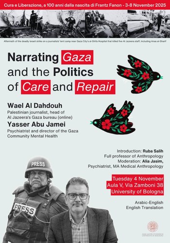 Il seminario riunisce Wael Al Dahdouh, capo redattore di Al Jazeera a Gaza, e Yasser Abu Jamel, psichiatra e direttore del Gaza Community Mental Health Programme, per riflettere sulle forme di narrazione e di cura che emergono da Gaza di fronte alla violenza coloniale e alla distruzione sistematica. Attraverso le loro esperienze – giornalistica e clinica – il seminario interroga la possibilità di una politica della cura e della riparazione come pratiche di resistenza