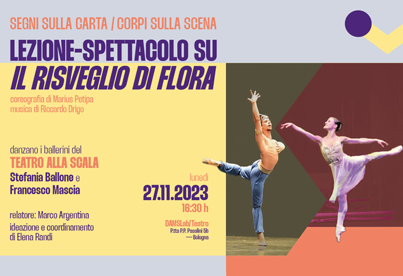 On November 27, 2023, at the Teatro del DamsLab in Bologna (University of Bologna), and on March 10, 2025, at the Teatro dei Rinnovati in Siena (University of Siena), Marco Argentina presented the philological reconstruction choices of Le Réveil de Flore and showcased selected excerpts performed by two distinguished dancers of the Teatro alla Scala company, Stefania Ballone and Francesco Mascia.