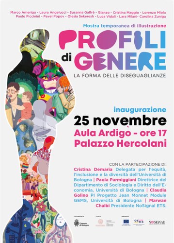 Martedì 25 novembre, Giornata Internazionale per l’eliminazione della violenza contro le donne, verrà inaugurata a Palazzo Hercolani una mostra temporanea di illustrazione dal titolo “Profili di genere. La forma delle diseguaglianze”, frutto di una collaborazione tra il nostro Dipartimento e l’Associazione Culturale NoSignal ETS, nell’ambito del Progetto Jean Monnet Module, G.E.M.S., di cui è responsabile la prof.ssa Claudia Golino.