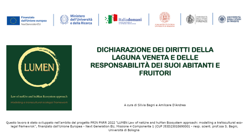 Il quarto modello di legge del progetto LUMEN, elaborato dagli esperti Silvia Bagni e Vito Comar dell’Università di Bologna, riconosce la Laguna Veneta come un ecosistema di valore intrinseco, risultato di millenni di interazione tra componenti naturali e attività umane, comprendente barene, velme, canali, bassi fondali, dune e argini. La Dichiarazione mira a proteggere l’integrità ecologica, la biodiversità, i cicli vitali e il patrimonio culturale e bioculturale della Laguna, promuovendo un rapporto armonico tra gli esseri umani e l’ambiente lagunare.