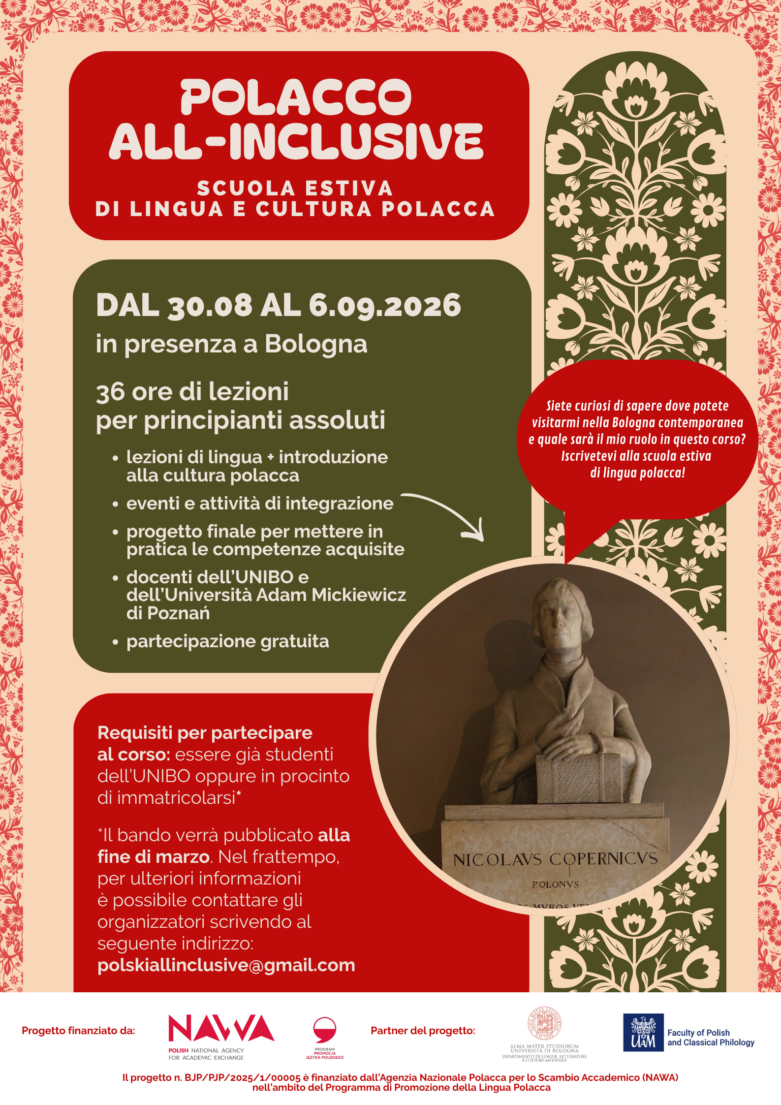 SCUOLA DI LINGUA E CULTURA POLACCA - DAL 30 AGOSTO AL 6 SETTEMBRE 2026 PRESSO IL DIPARTIMENTO DI LINGUE, LETTERATURE E CULTURE MODERNE DELL'UNIVERSITÀ DI BOLOGNA