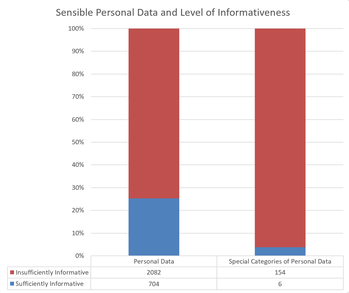 Overall, the results show a marked predominance of insufficiently informative clauses across many categories of personal data, suggesting that privacy policies often fail to provide complete or sufficiently clear information regarding the data being collected and processed.