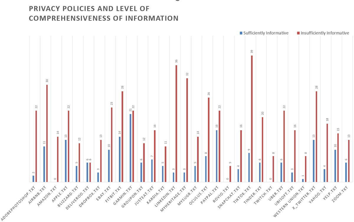 The analysis also reveals considerable variation among companies in the level of informational quality. While some privacy policies contain a relatively higher number of sufficiently informative clauses, most exhibit a substantial proportion of clauses that fail to meet the required level of transparency and completeness.