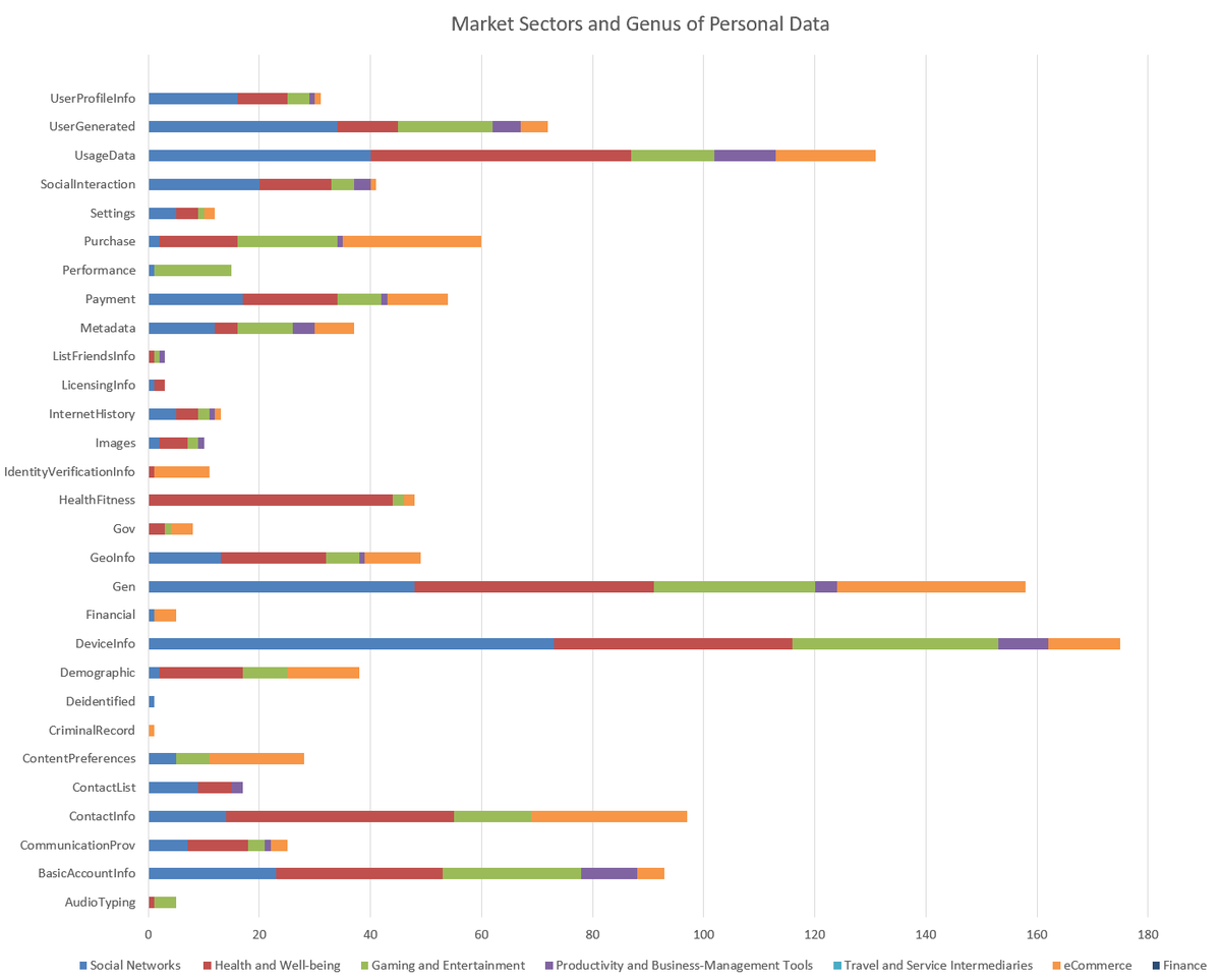Overall, the chart highlights how the categories of personal data referenced in privacy policies vary significantly across market sectors, reflecting both the operational requirements of the services and the different types of data processing activities involved. This sectoral distribution provides important insights into the structural logic of data collection practices and the informational patterns emerging from privacy policies in different areas of the digital economy.
