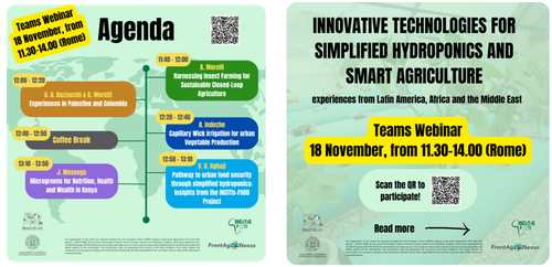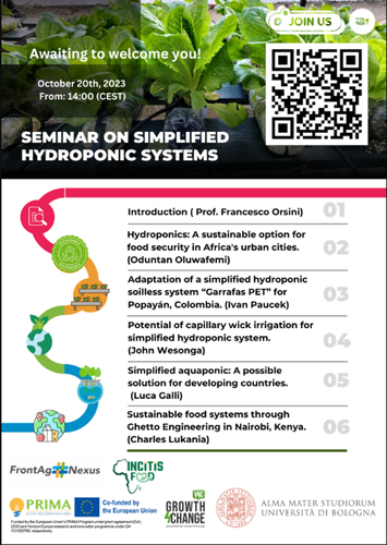 Hydroponics is a cutting-edge technology that allows food to be produced without soil, optimizing the use of water and nutrients. However, high costs and advanced technology risk make it accessible only to an elite, excluding the most vulnerable socio-economic contexts, such as urban areas in emerging countries. Simplified hydroponics offers a concrete solution: thanks to the use of recycled and low-cost materials, it can also be implemented in low-income environments, helping to improve access to food and food security. We discussed this on October 20, 2023, at a publicly accessible webinar with researchers from various international institutions: from the University of Ibadan (Nigeria) to the Italian-Latin American Institute (Colombia), Jomo Kenyatta University (Kenya), and the ghetto engineering initiatives promoted in Nairobi by Growth4Change. Agriculture students at Alma Mater Studiorum – University of Bologna were thus able to learn firsthand how simplified hydroponics can truly become a key tool for strengthening food security in the cities of today and tomorrow.