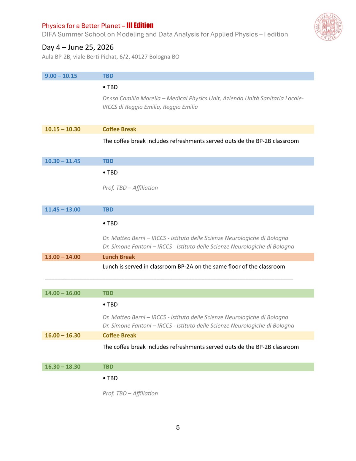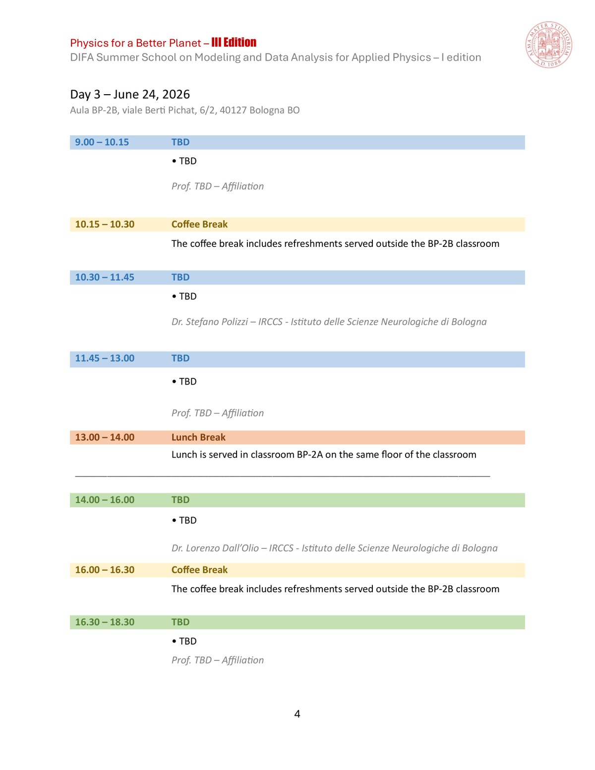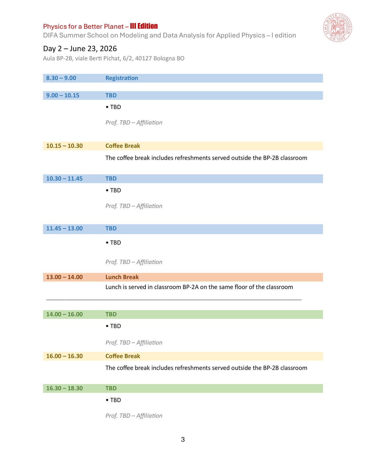 All the lectures scheduled for the entire week, from 23 June 2026 to 25 June 2026, will be held in the BP-2B room at the Department of Physics and Astronomy, located at Viale Berti Pichat 6/2 at the second floor.