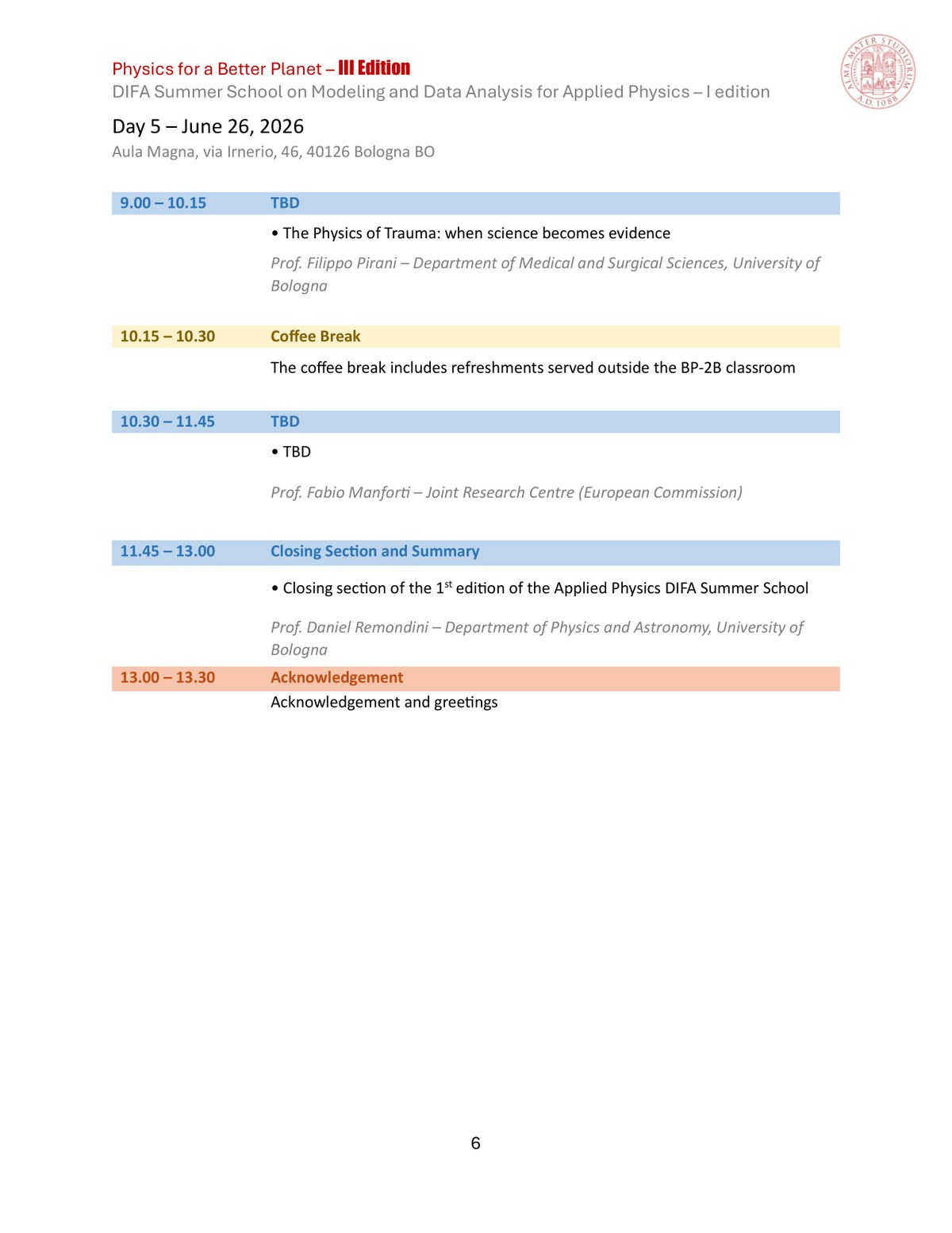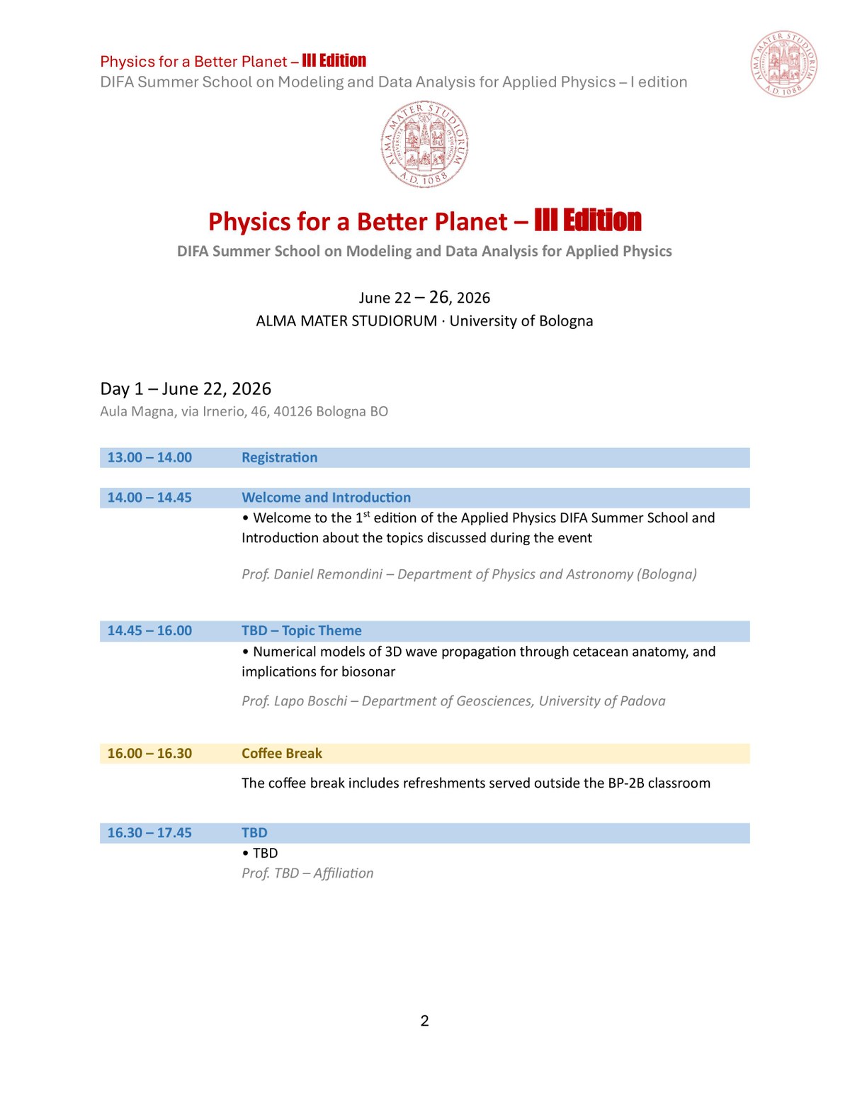 The opening lectures on June 22, 2026, and the closing lectures on June 26, 2026, will be held in the Aula Magna at the Department of Physics and Astronomy, located at Via Irnerio 46.