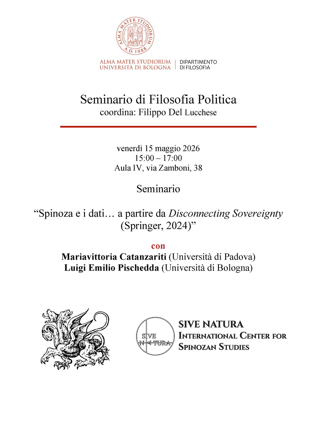 Mariavittoria Catanzariti (UniPD) dialogherà con Luigi Emilio Pischedda (UniBO) sulla possibilità della filosofia spinoziana di pensare il rapporto tra data, reti e istituzioni.