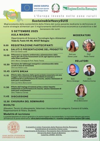 Il seminario conclusivo del progetto SustainableHeavySuis ha lo scopo di presentare e discutere con Allevatori, Tecnici di allevamento, Veterinari, Associazioni di categoria, Consorzi di tutela e Rappresentanti di filiera, le conoscenze acquisite durante il PSR Emilia Romagna 2023-2027.