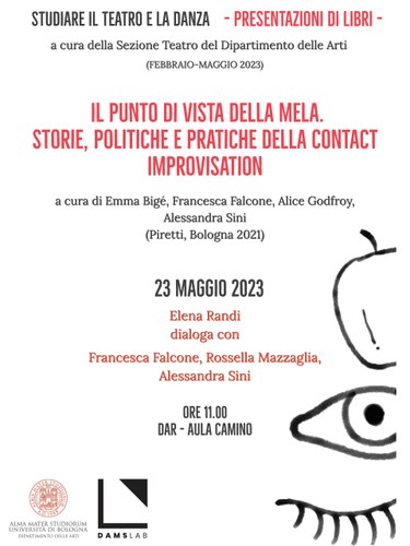 La presentazione del volume Il punto di vista della mela. Storie, politiche e pratiche della Contact Improvisation (Piretti, Bologna 2021), a cura di Emma Bigé, Francesca Falcone, Alice Godfroy e Alessandra Sini, si colloca all’interno del progetto “Studiare il teatro e la danza”, curato dai membri della Sezione teatro del Dipartimento delle Arti, che accoglie una articolata serie di presentazioni di recenti pubblicazioni esito di progetti di ricerca, percorsi di studio o approfondimenti puntuali, offrendo una testimonianza della vivacità degli studi teatrologici.