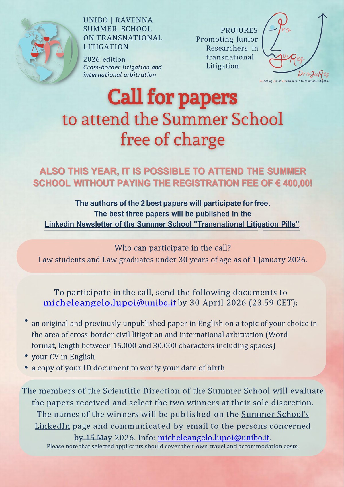 Until 30 April 2026 (23.59 CET) those who are entitled to apply to the call for papers can send their applications to try to attend the Summer School free of charge.